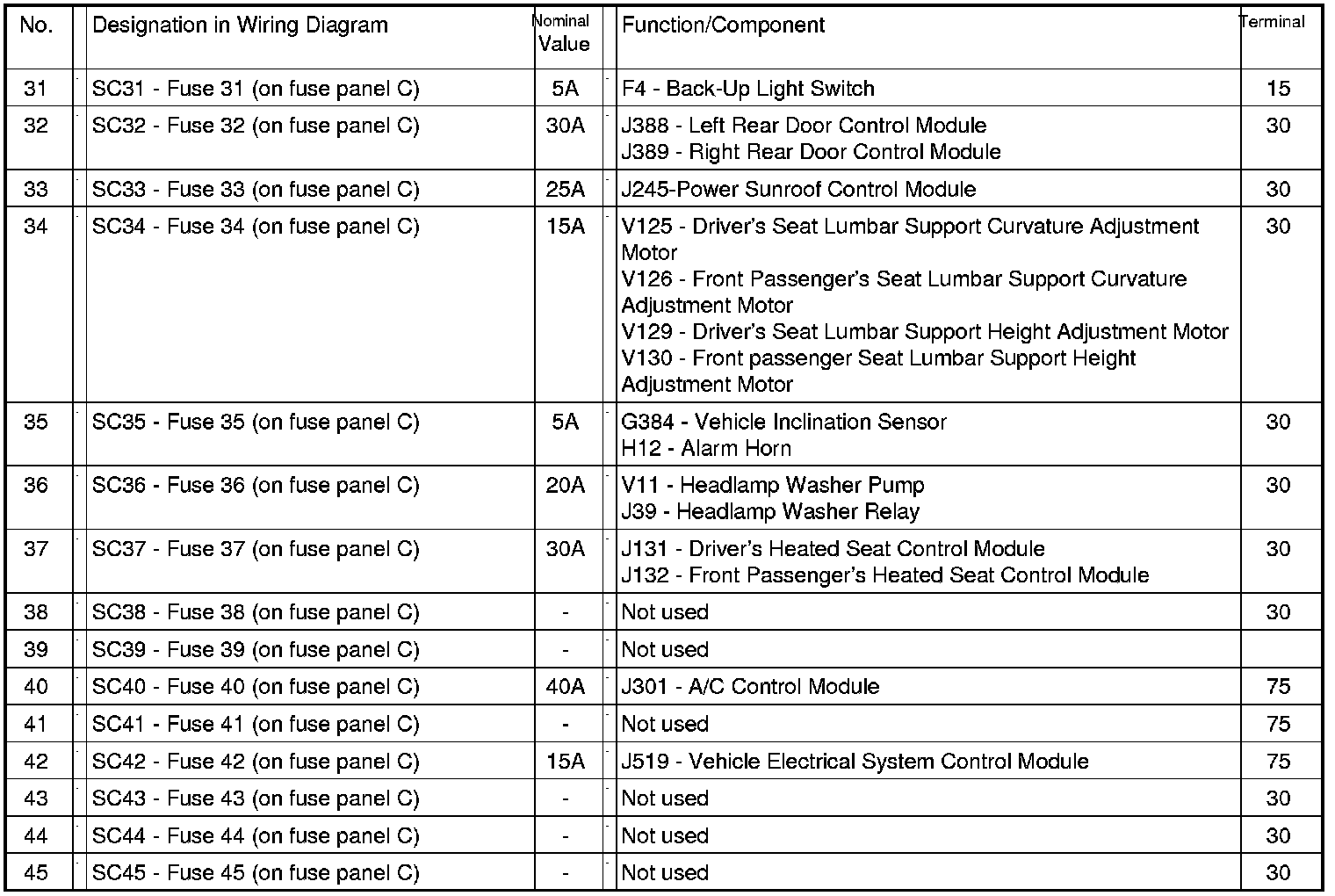Fuses (SC) On Fuse Panel C (electronics Box High) , from November 2004