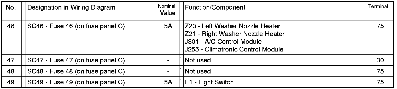Fuses (SC) on fuse panel C (electronics box High), from November 2004