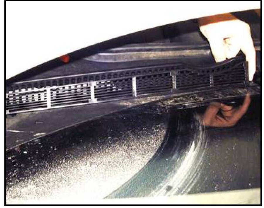 ^ Insert longer tabs of grille into plenum chamber cover (toward windshield).