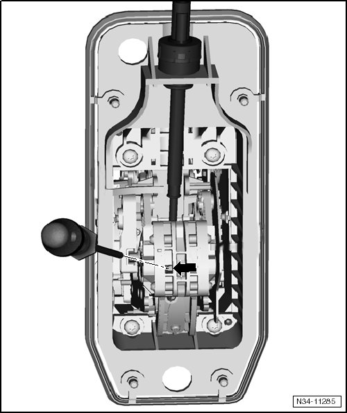 The shift housing is pushed slightly off the selector lever cable in the - direction of arrow -.