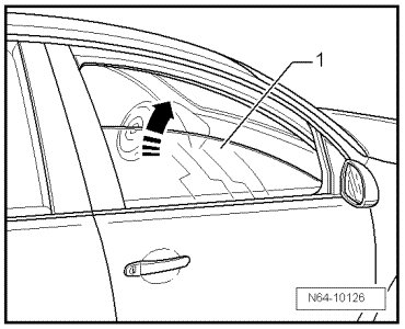 - Raise rear door window - 1 - and swivel out of door toward front in - direction of arrow -.