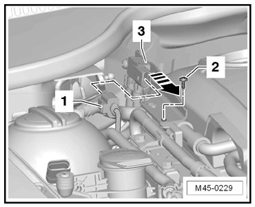 - Remove the bolt - 2 - and then remove the bracket - 3 - together with the Exhaust Pressure Sensor 1 (G450) in - direction of arrow -.