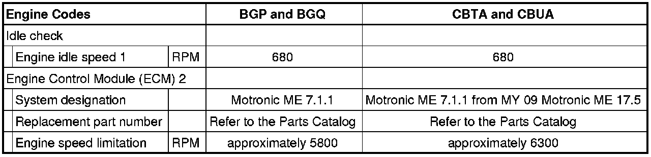 • 1 Applies to manual and automatic transmission. If voltage supply of Engine Control Module (ECM) drops below 12 volts, idle speed is raised in stages up to 780 RPM. Idle speed is not adjustable.