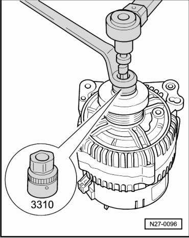 - Use the (VAS 3310) to remove the ribbed belt pulley nut from the generator shaft.