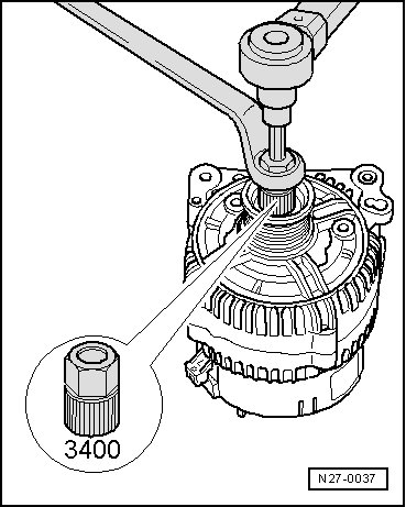 - Insert the (VAS 3400) into the pulley with ribbed belt pulley with free-running hub for the Generator (C) using and open-end wrench.