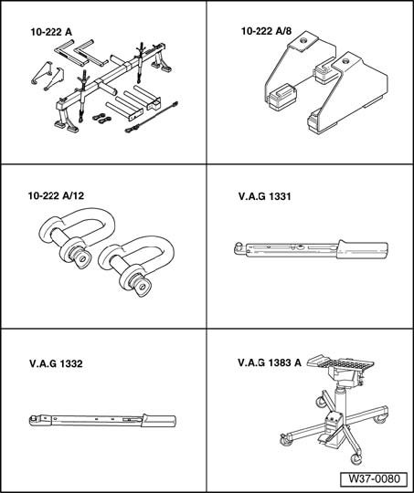 - If necessary, secure hook of left spindle (on transmission side) using shackle 10 - 222 A /12 on engine lifting eyelet.