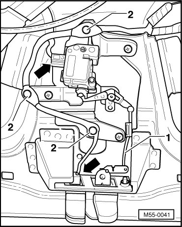 - Remove bolts - 1 - and remove wiring harness support - 2 -.