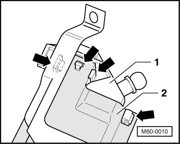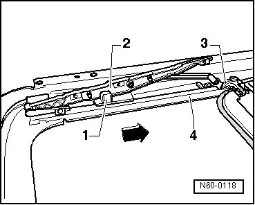 - Using a screw driver, disengage rain channel - 1 - carefully on both sides at bearing on guide catch - 2 - and remove.