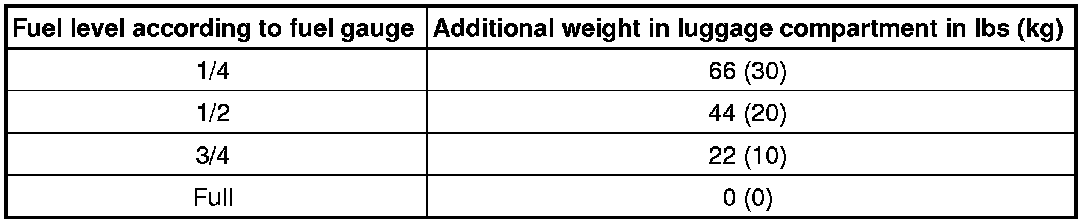 - Read fuel level from fuel gauge. Calculate additional weight needed using the following table. Place extra weight in luggage compartment.