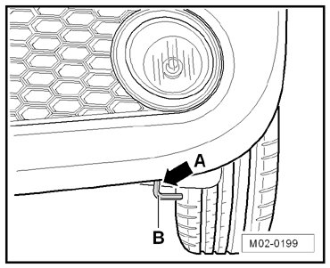 Adjuster is located on rear side of fog lamp - arrow A - and can be adjusted using a hex socket - B -.