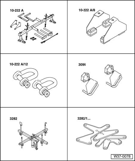 - If necessary, secure hook of left spindle (on transmission side) via a shackle 10 - 222 A /12 on engine lifting eyelet.