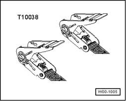 - Place tension belt T10038 behind pins - arrows - around exhaust system and hang them on right spindle.