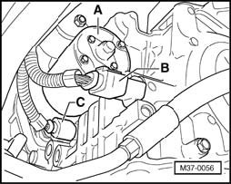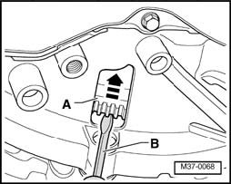 - Press transmission off from engine, when doing this press torque converter - A - using a screwdriver - B - out of drive plate in direction of - arrow -.