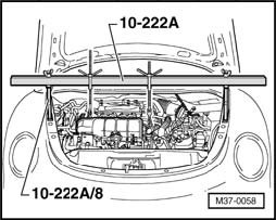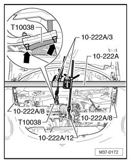 - Attach engine support bridge 10 - 222 A with adapter 10 - 222 A /8 and adapter 10 - 222 A /3 in front of gas-filled strut for hood.