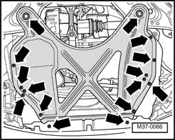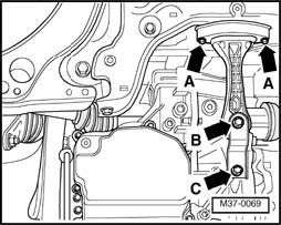 CAUTION: Before installing the transmission bracket/transmission mounting bolts, ensure that the bracket and mounting are absolutely parallel to one another or the threads will be damaged. Press the transmission upward in the area of the final drive using Engine/transmission jack V.A.G 1383 A, if necessary.