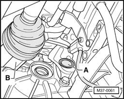 - Remove right drive axle - B - from transmission in direction of - arrow -.
