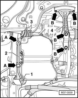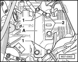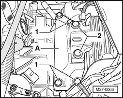 - Remove transmission bracket - A - (remove bolts - 1 - and - 2 -).