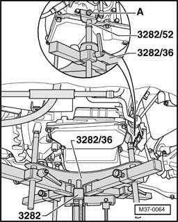Transmission support 3282 is attached to adjustment plate 3282/36 for removing 6 Spd. Automatic Transmission 09G.