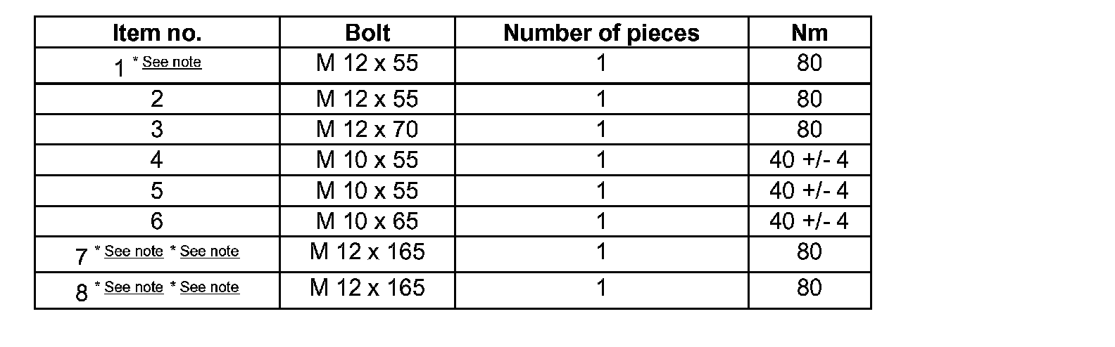 - Install all engine/transmission connecting bolts items 1 to 8, see tightening torques.
