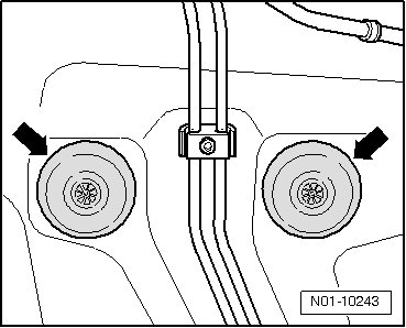 On sealing caps - arrows -, check for cracks, displacement and corrosion of underbody guard in particular.