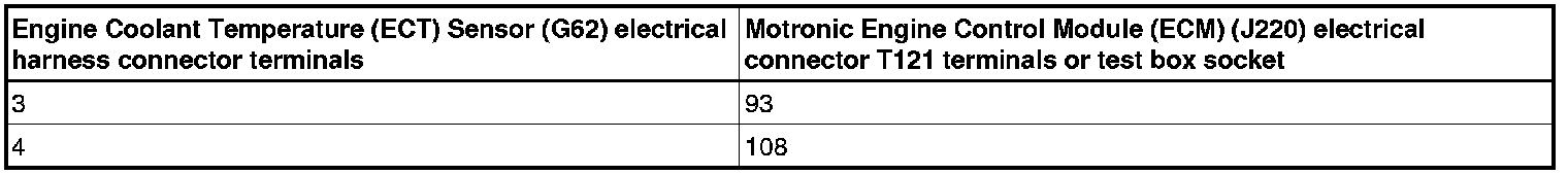 - Using a multimeter, check the Engine Coolant Temperature (ECT) Sensor (G62 ) electrical harness connector terminals to the Motronic Engine Control Module (ECM) (J220) electrical harness connector for an open circuit or a short to voltage, refer to the chart below.