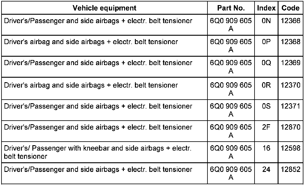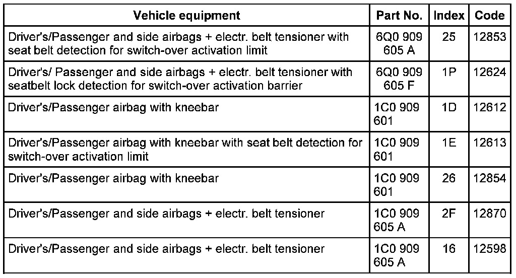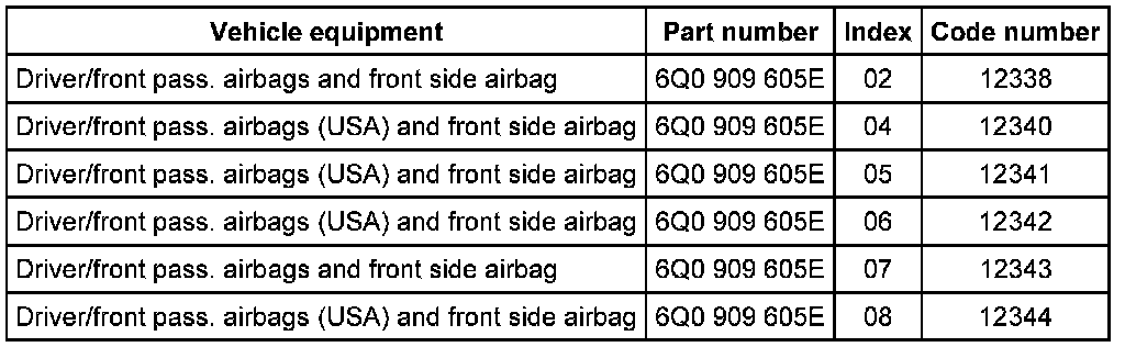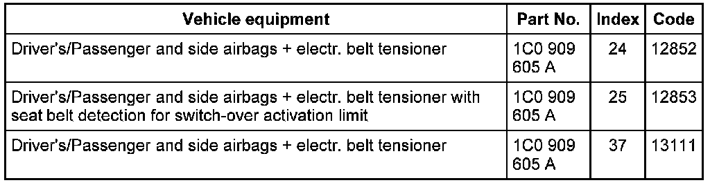 NOTE: Airbag Control Module -J234- current coding numbers can be found in the Vehicle Diagnosis, Testing and Information System VAS 5051.