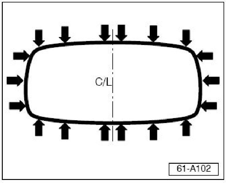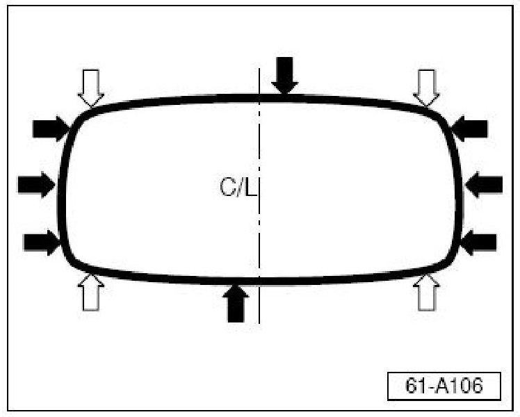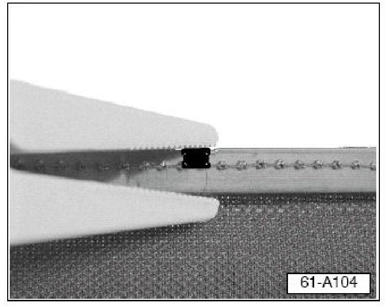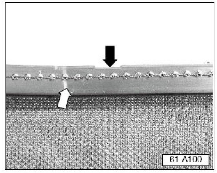 - Install 18 clips Part No: 1Y0871234A (silver) around the headliner beading (1 at each notch (black arrow) cut into the beading as follows: