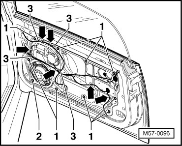 - Remove bolts - 1 -, - 3 - and nut - 2 -. Remove upper subframe from door, lift and lift out from door toward hinge side of door.
