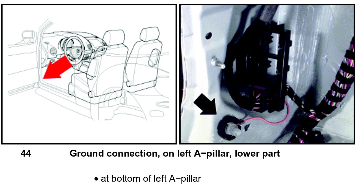 Ground Connection, On Left A-pillar, Lower Part 44: