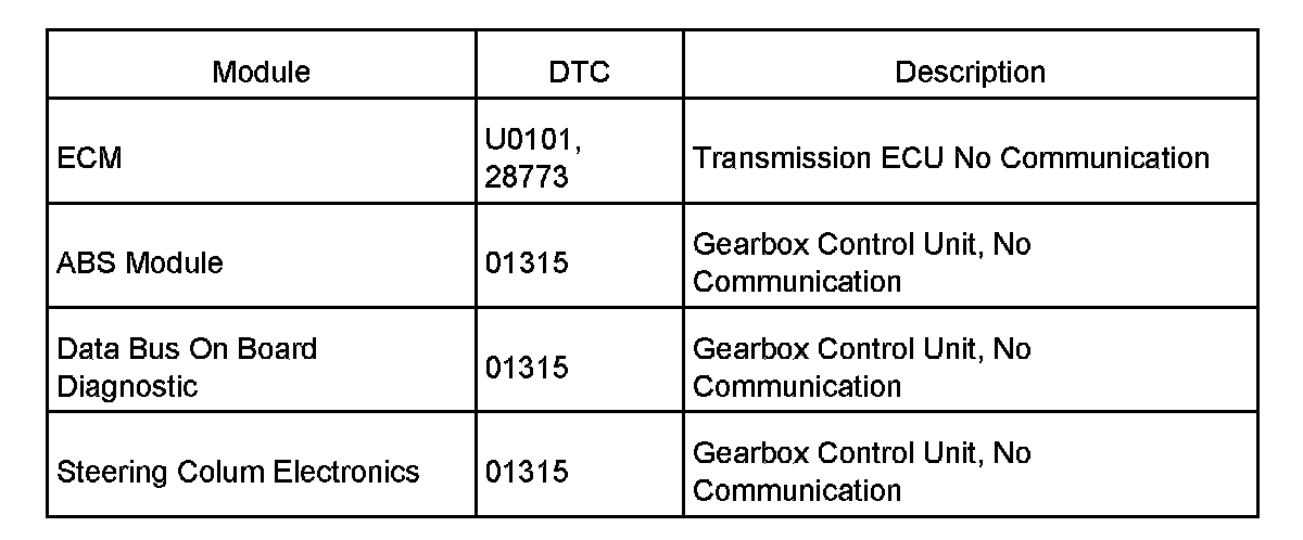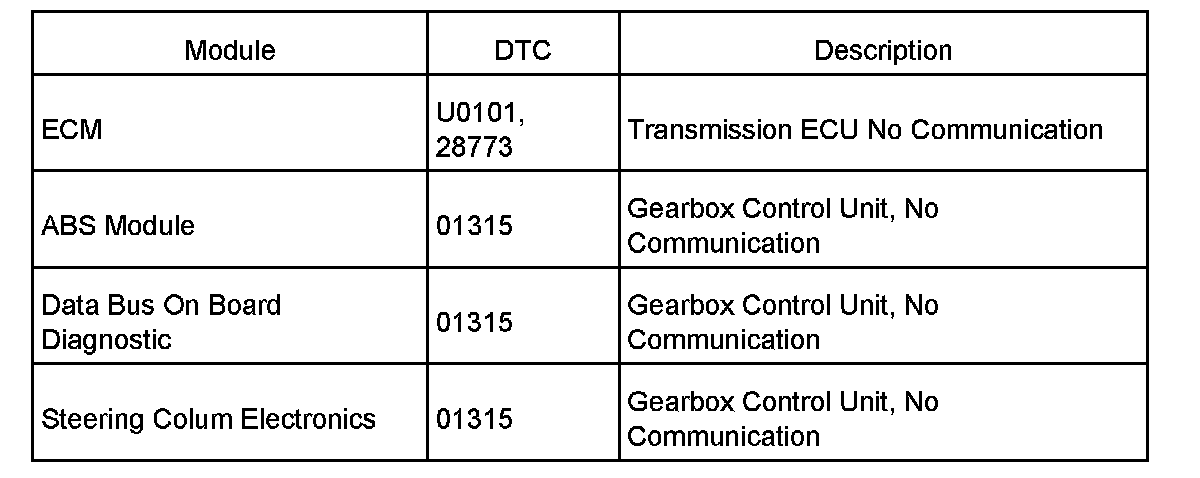 Symptom may be accompanied by No Communication from Transmission Control Module (TCM) DTCs from table below.