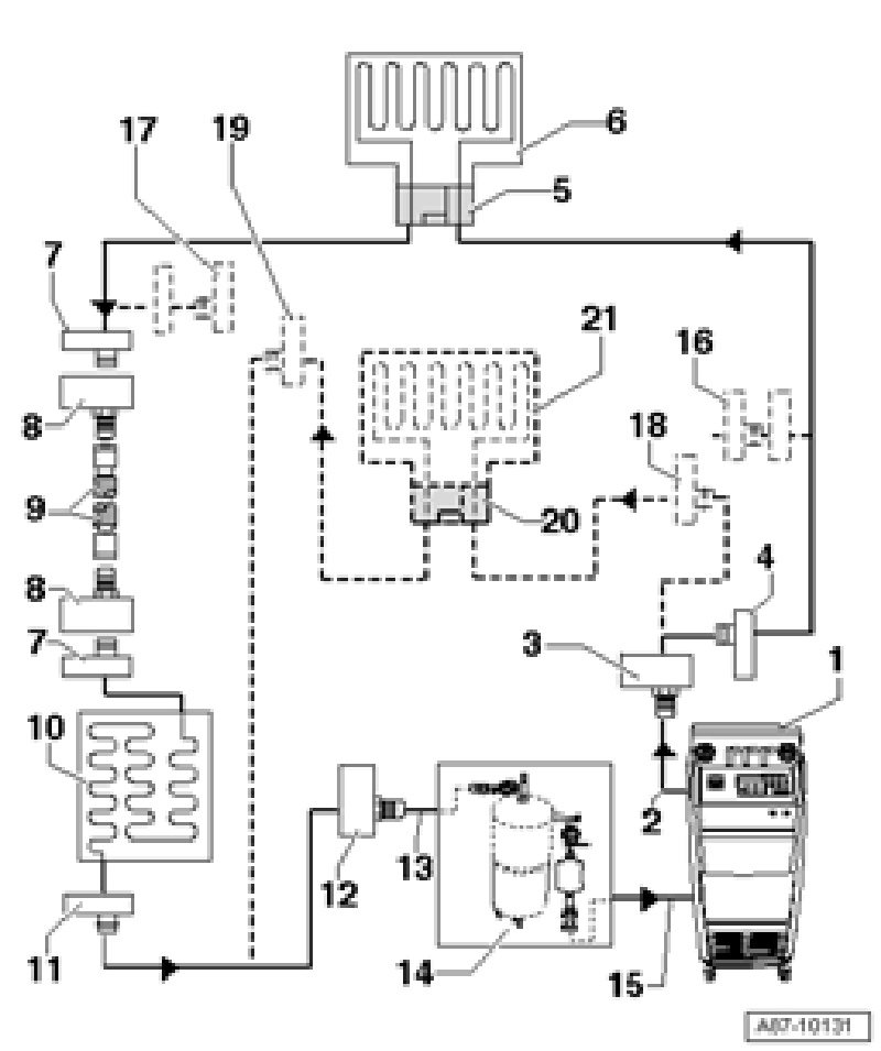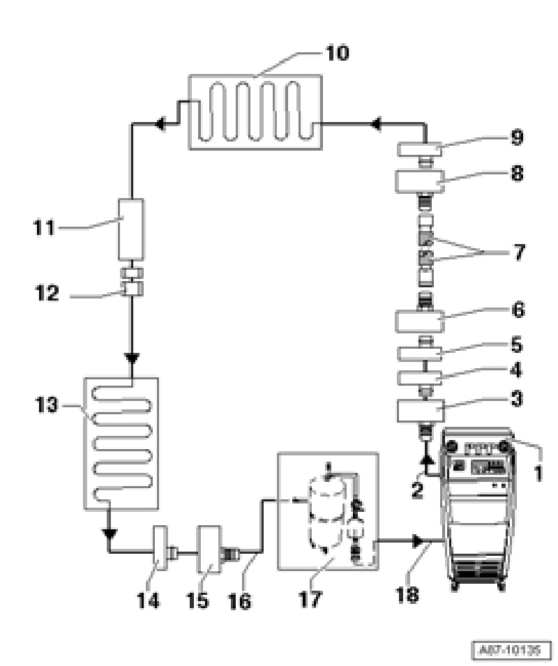 - Set up Refrigerant Circuit Flushing Device VAS 6336/1 or Refrigerant Circuit Flushing Device VAS 6337/1 between service station and refrigerant circuit return line.