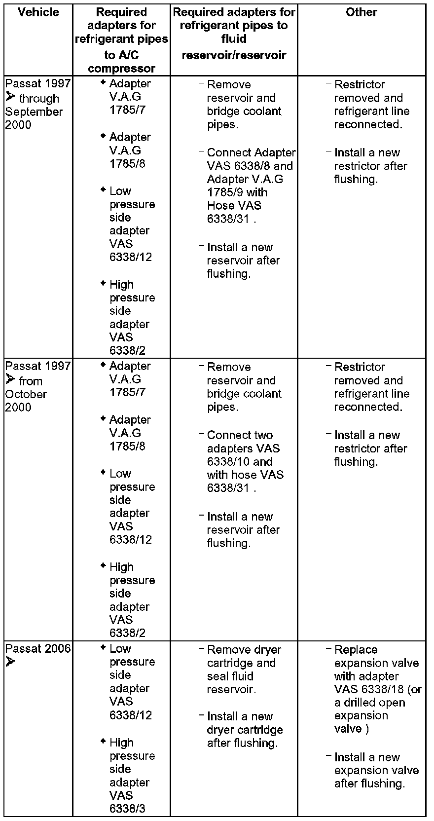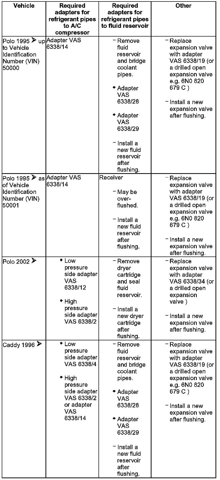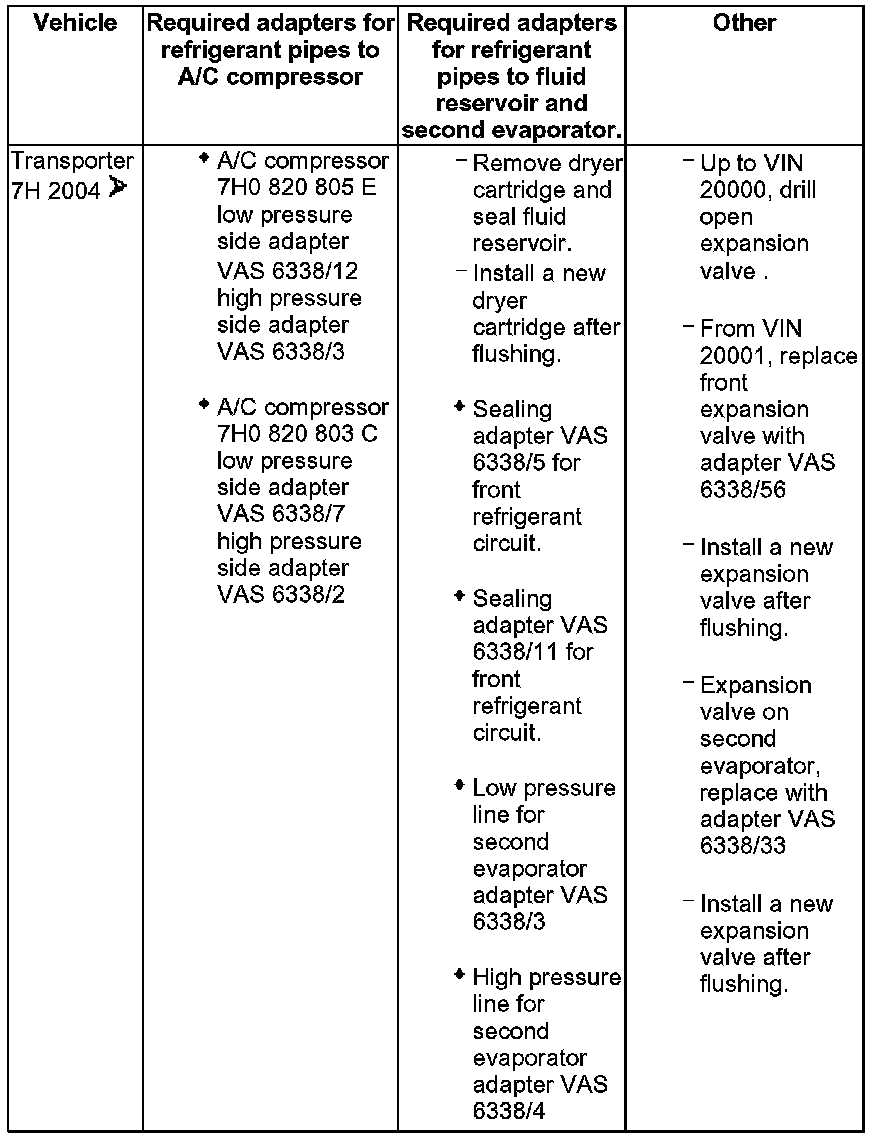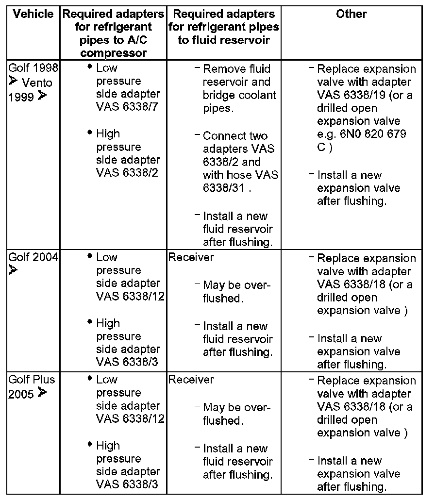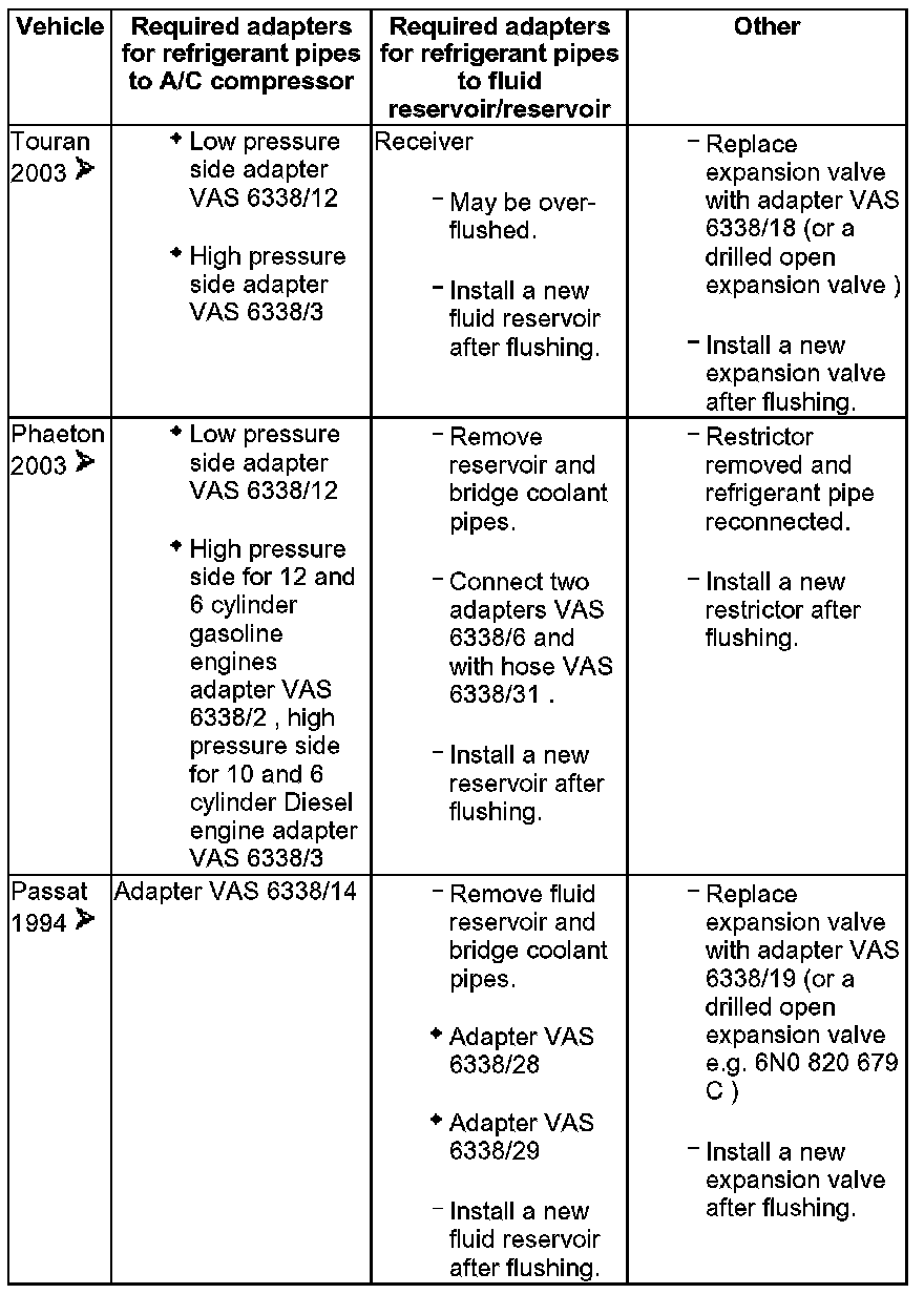 - Various adapters which are required to connect the A/C service station to the refrigerant circuit for flushing and to bridge the removed fluid reservoir or reservoir and expansion valve (specific to vehicle) are in the following table.
