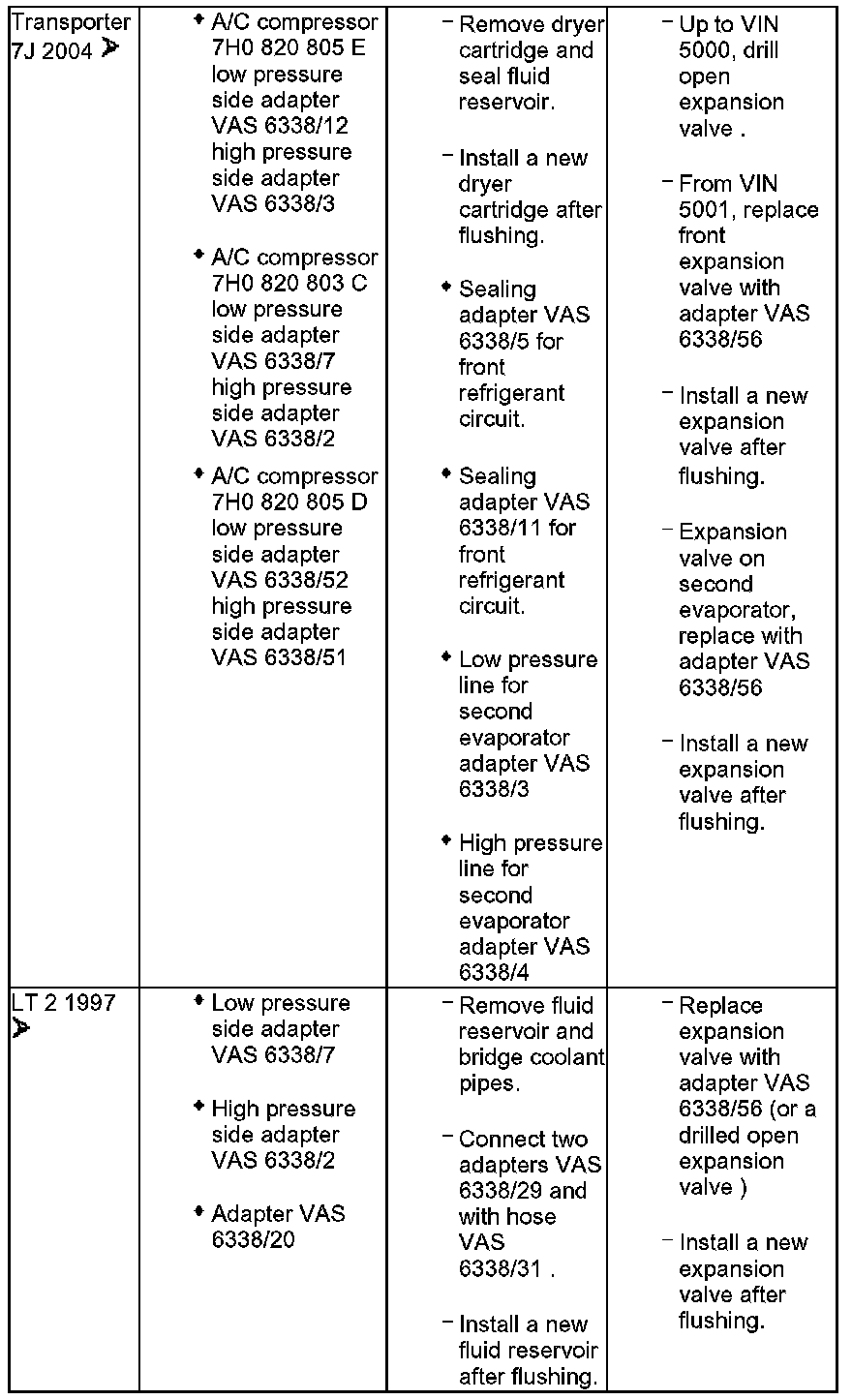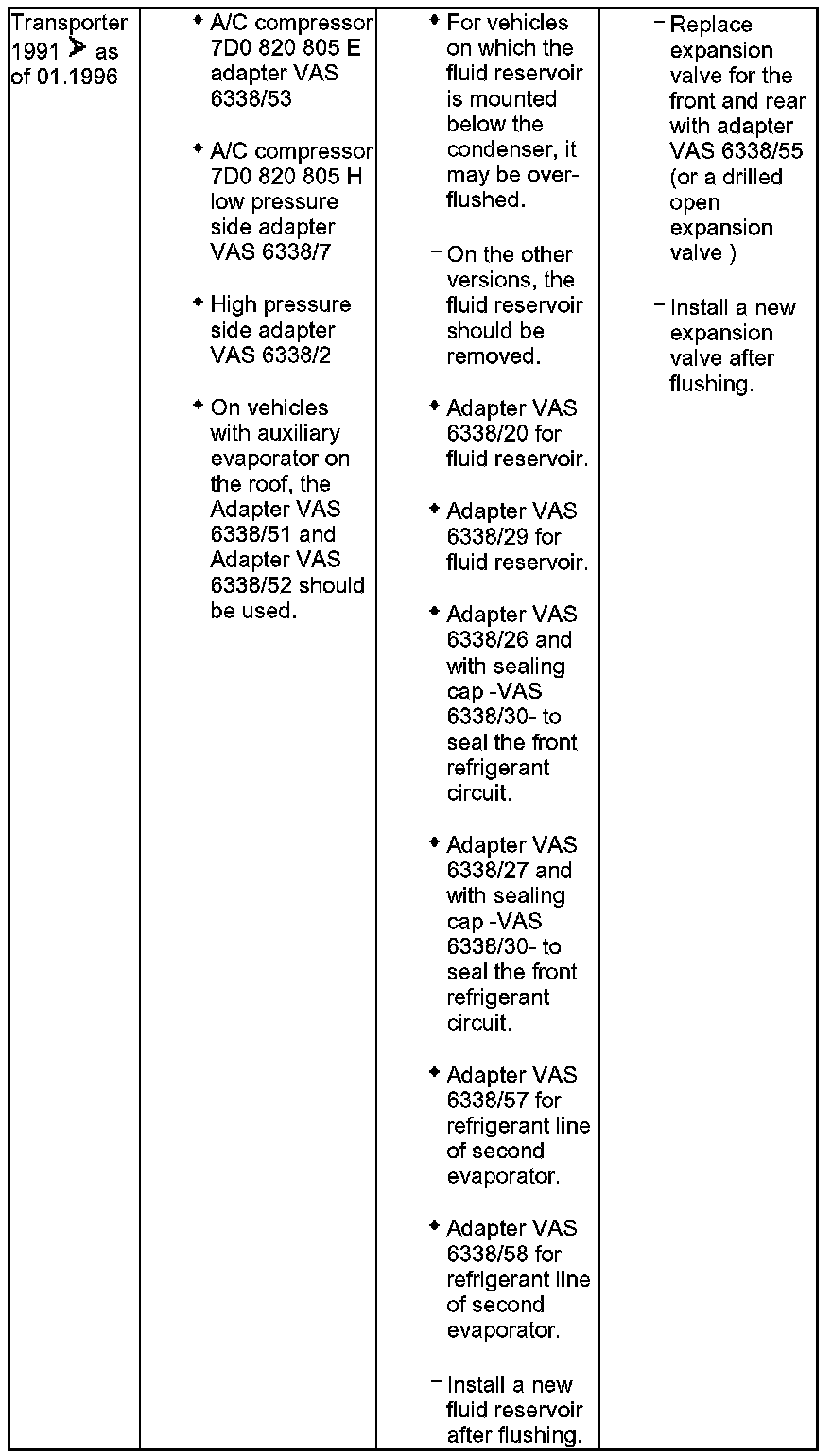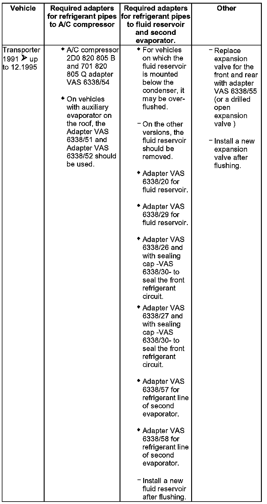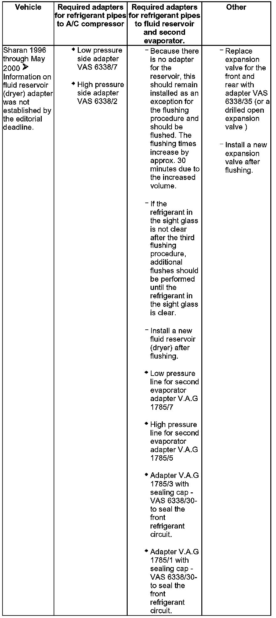 - Various adapters which are required to connect the A/C service station to the refrigerant circuit for flushing and to bridge the removed fluid reservoir or reservoir and expansion valve (specific to vehicle) are in the following table.
