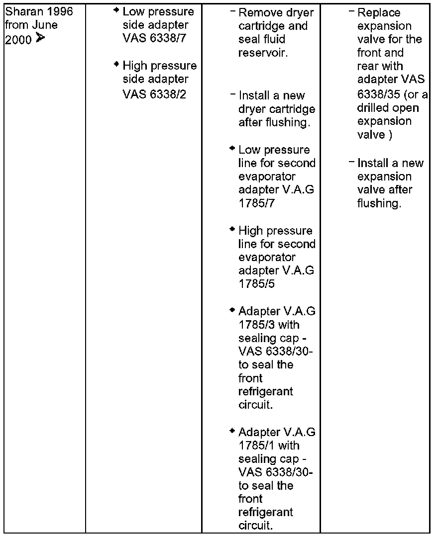 - On vehicles with second evaporator (Sharan), the front and rear refrigerant circuits must be flushed individually. Seal the front refrigerant circuit using adapter V.A.G 1785/1, adapter 1785/3 and sealing caps VAS 6338/30.