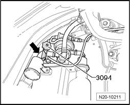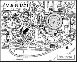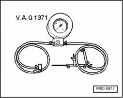 - Connect tester V.A.G 1371 as shown between Evaporative Emission (EVAP) Canister Purge Regulator Valve N80 - arrow - and vent line.
