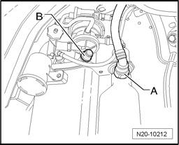 - Now check vent line, Leak Detection Pump (LDP) V144 and EVAP canister for leaks. To do so, disconnect vent line - A - from EVAP canister and seal connection using a plug - B -.