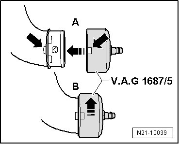 - Connect the (V.A.G 1687/5) to the charge air hose - A - and rotate it around approximately 90° - B -.