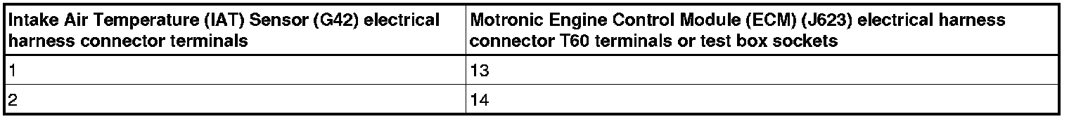 - Using a Multimeter, check the Intake Air Temperature (IAT) Sensor (G42) electrical harness connector terminals to the Motronic Engine Control Module (ECM) (J623) electrical harness connector T60 terminals for an open circuit according to the wiring diagram.