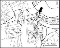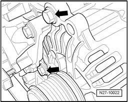 - Release tension on ribbed belt by swinging tensioning element using a 16 mm open-end wrench in direction of -arrow-.