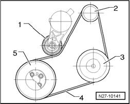 CAUTION: Before removing ribbed belt, mark the top side and direction of travel. When installing, pay attention to correct running direction and installation position. If the belt is installed in the opposite running direction or is positioned incorrectly, the belt will fail.