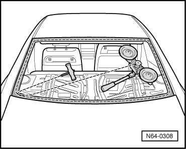 - Push cutting cord through adhesive sealant into vehicle interior at lower area of rear window using awl from (V.A.G 1474 A).