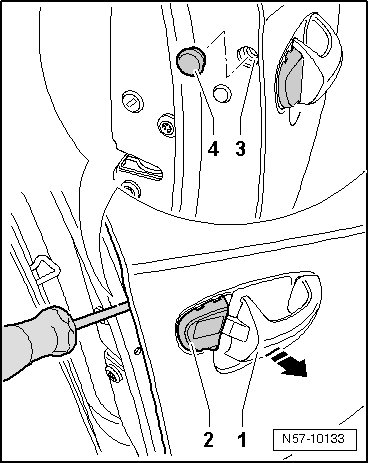 - Pull out door handle - 1 - in - direction of arrow - until it stops and unscrew bolt - 3 - far enough until lock cylinder housing - 2 - can be pulled out.