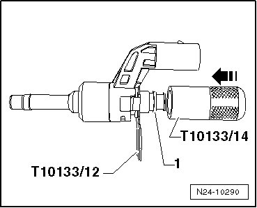- Turn the (T10133/14) around (knurled side no longer faces toward fuel injector). Slide the (T10133/14) over the support washer - 1 - in the - direction of the arrow - to the stop on the (T10133/12).
