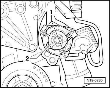 - Remove the coolant pump bolts - 1 - and then remove the coolant pump - 2 -.