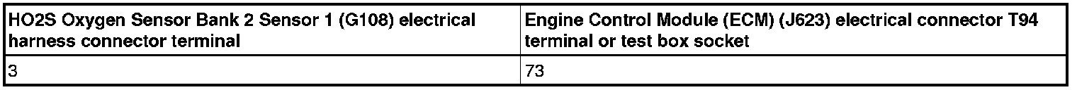 - Using a multimeter, check the Oxygen Sensor Heater Bank 2 Sensor 1 (Z28) electrical harness connector to the Engine Control Module (ECM) (J623) electrical harness connector T94 for an open circuit.