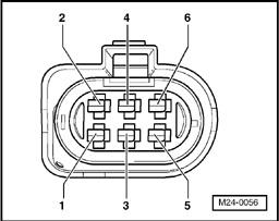 - Check voltage supply at 6-pin connector terminal 4 to Motronic Engine Control Module (ECM) Power Supply Relay 2 -J670- according to wiring diagram.