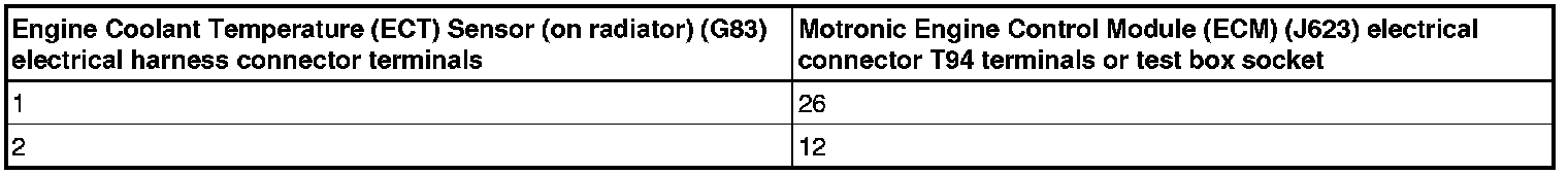 - Using a multimeter, check the Engine Coolant Temperature (ECT) Sensor (on radiator) (G83) electrical harness connector terminals to the Motronic Engine Control Module (ECM) (J623) electrical harness connector T94 terminals for an open circuit according to the wiring diagram.