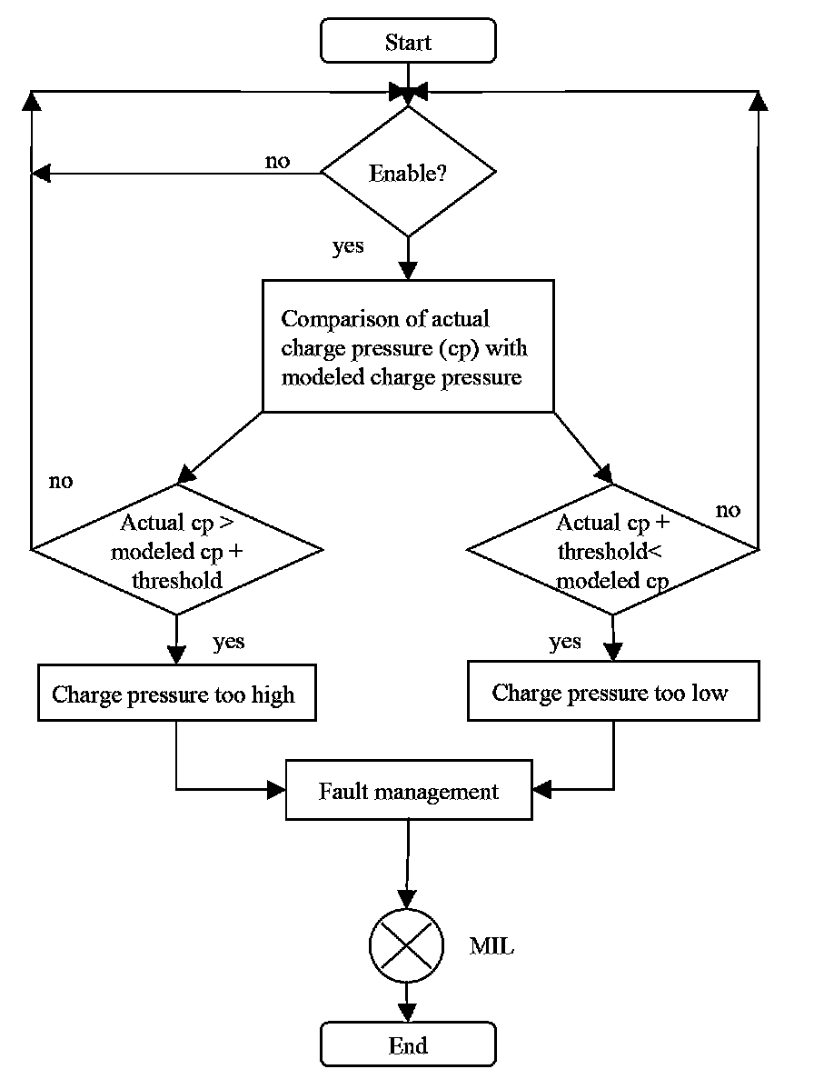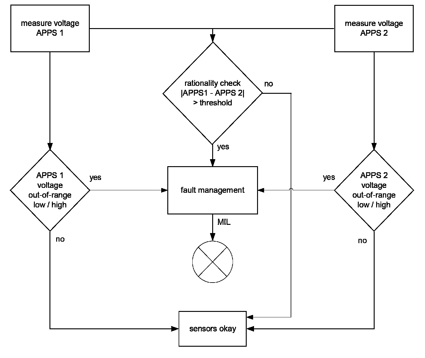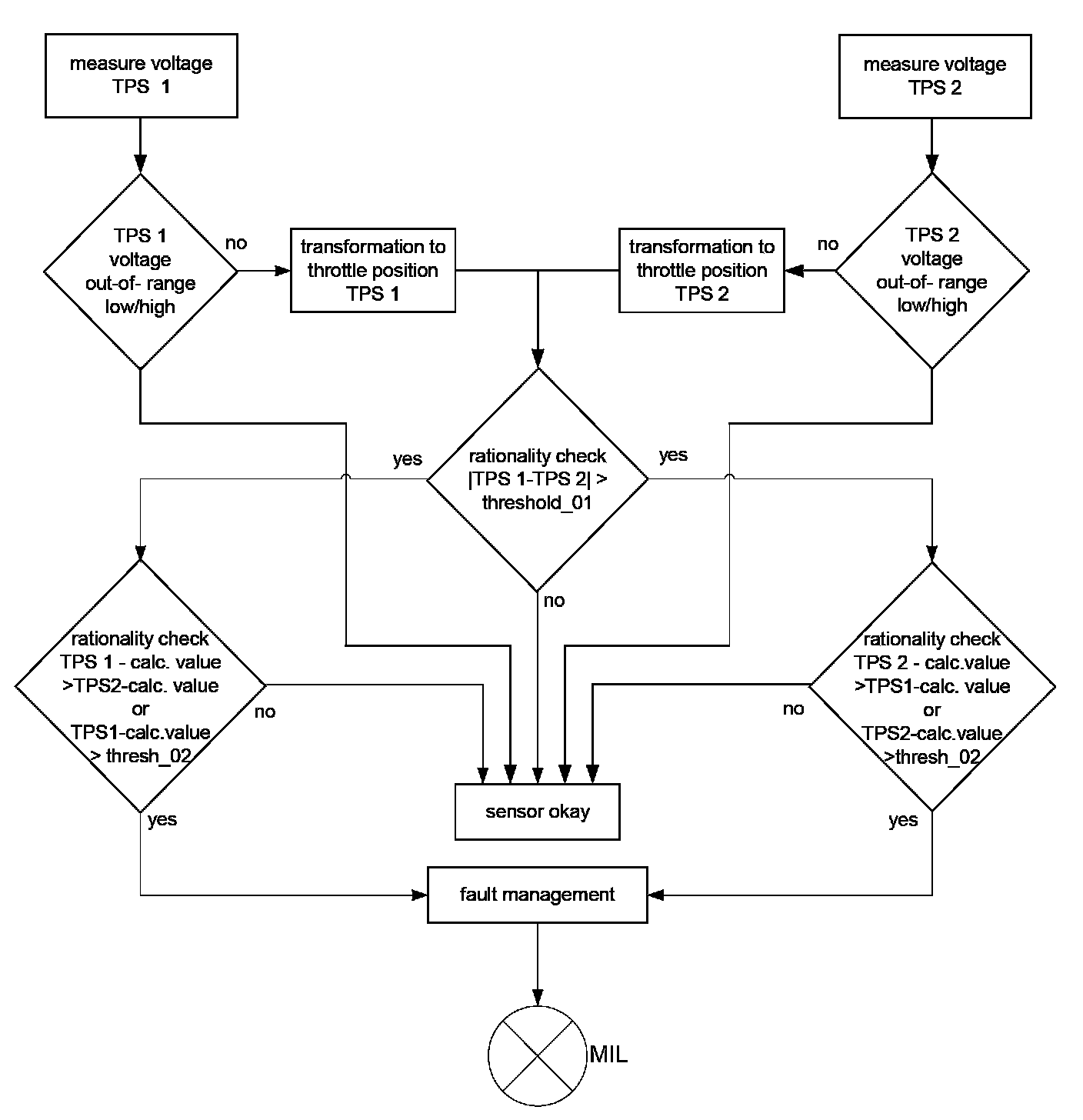 The throttle body consists of two potentiometers (reversed voltage logic). During the first start, the potentiometer characteristics are adapted and stored. The diagnostic monitors the corrected values of potentiometer 1 and 2. In the case of a higher difference than a threshold value both signals are compared to the engine load to determine and disable the faulty one. A fault code will be stored and the MIL will be illuminated.
