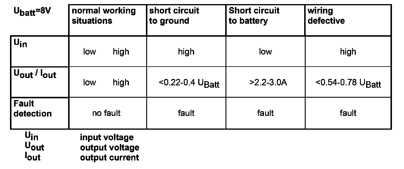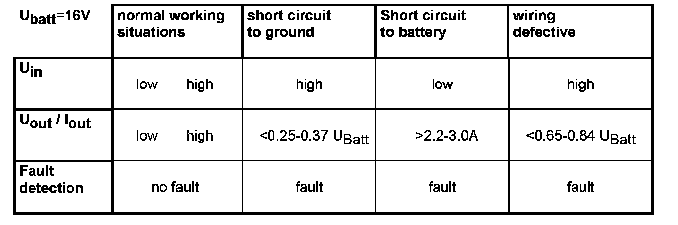 The IC has a binary diagnostic line (e.g. SJ401). If the control line of one stage has a different signal than the output line, the logic circuit inside the IC detects a malfunction. The logic circuit within the IC can separate the type of fault to a short circuit to minus, an open line, or a short circuit to plus. The check result will be sent to the ECM via diagnosis line.