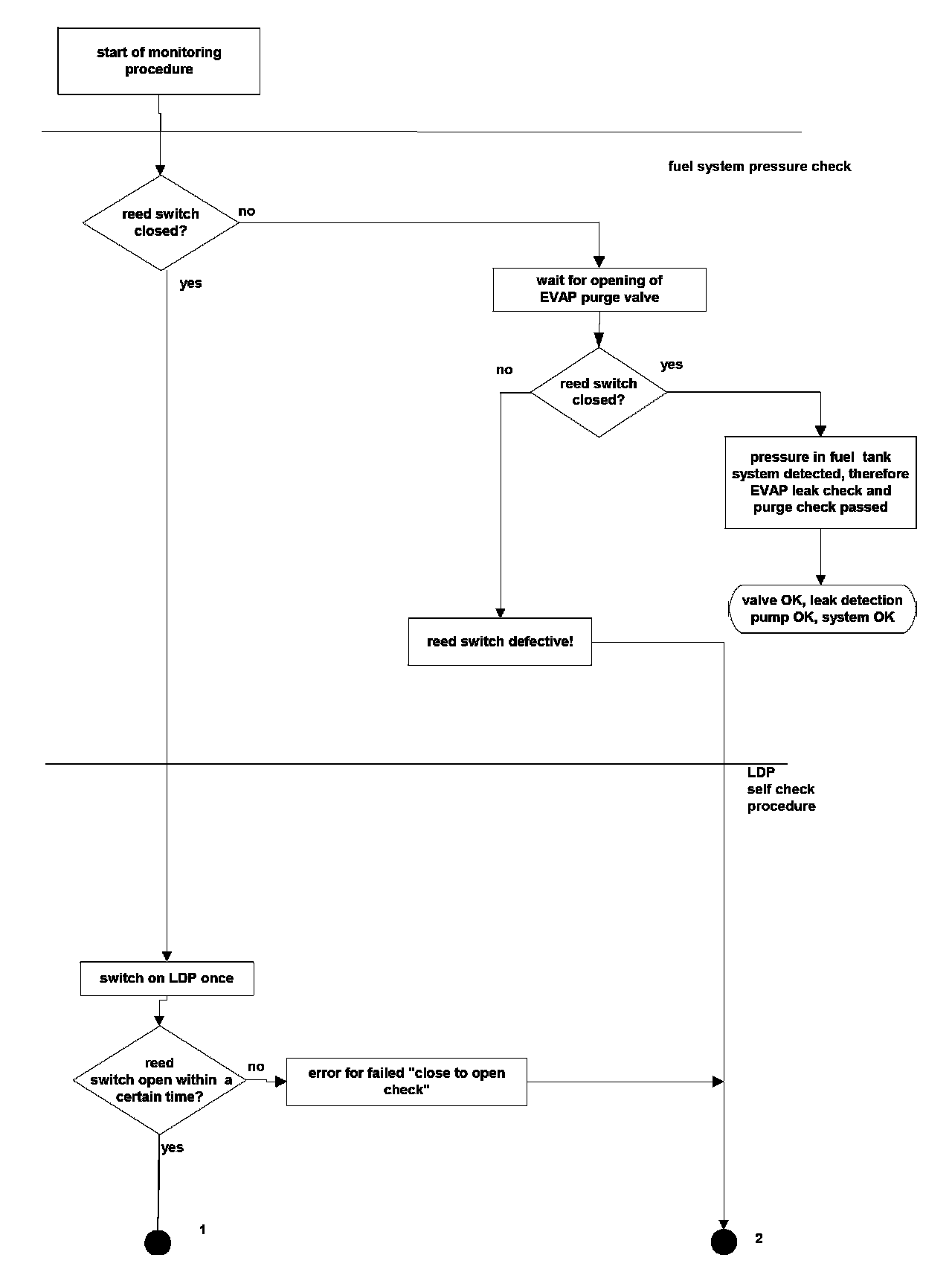 The first step of leakage diagnostics is the pressure check of fuel tank system by testing the reed switch. In case of an open reed switch, the fuel tank system has sufficient pressure for the sealed check and no further pressure has to be supplied to the fuel tank system by the LDP. The diagnosis is waiting until the EVAP purge valve is opened in order to purge the carbon canister. In case the reed switch remains open or the reed switch stuck open, the reed switch is defective.